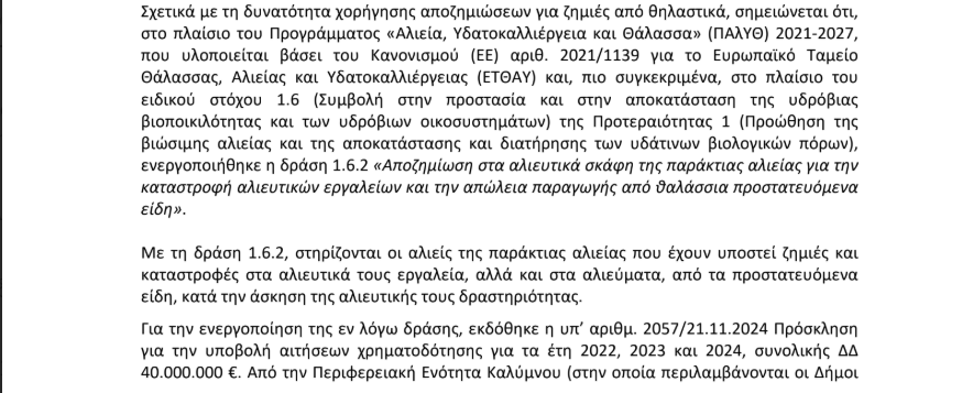 Σε ό,τι αφορά τις αποζημιώσεις για ζημιές από θαλάσσια θηλαστικά, ο Υφυπουργός υπενθύμισε ότι στο πλαίσιο του Προγράμματος «Αλιεία, Υδατοκαλλιέργεια και Θάλασσα» 2021-2027 έχει ενεργοποιηθεί η δράση 1.6.2, η οποία προβλέπει αποζημίωση για καταστροφή αλιευτικών εργαλείων και απώλεια παραγωγής από προστατευόμενα είδη. Για τον σκοπό αυτό, εκδόθηκε σχετική πρόσκληση τον Νοέμβριο του 2024, συνολικού ύψους 40 εκατ. ευρώ.