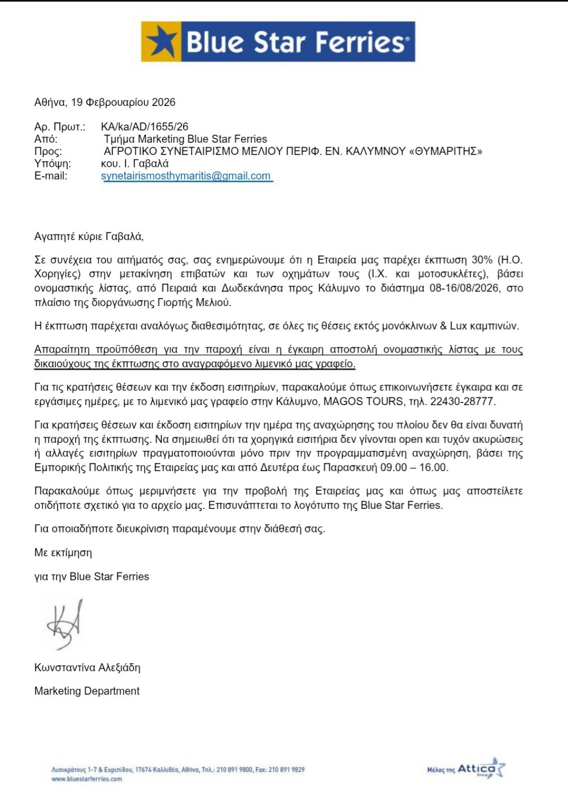 Σημαντική επιτυχία για τον Αγροτικό Συνεταιρισμό Μελιού Π.Ε. Καλύμνου «ΘΥΜΑΡΙΤΗΣ», καθώς μετά από ενέργειες του δραστήριου προέδρου του Γιάννη Γαβαλά , η εταιρεία Blue Star Ferries θα παρέχει έκπτωση 30% στις μετακινήσεις επιβατών και οχημάτων (Ι.Χ. και μοτοσυκλετών) στο πλαίσιο της διοργάνωσης της Γιορτής Μελιού 2026 στην Κάλυμνο.