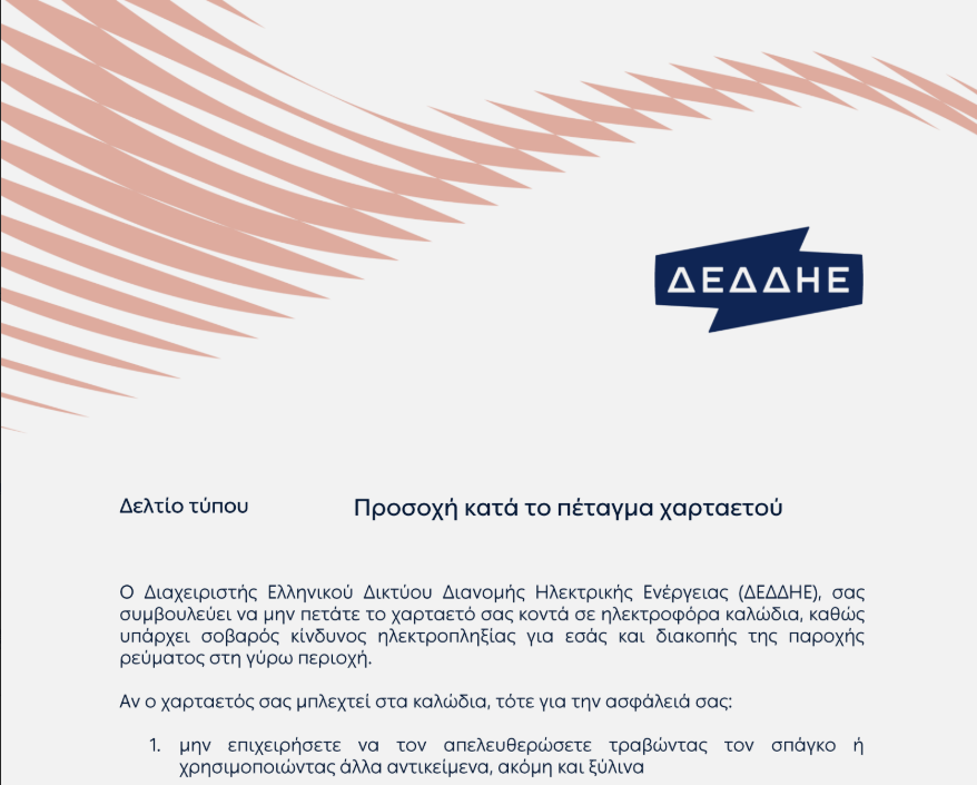 ΔΕΔΔΗΕ: Προσοχή κατά το πέταγμα χαρταετού