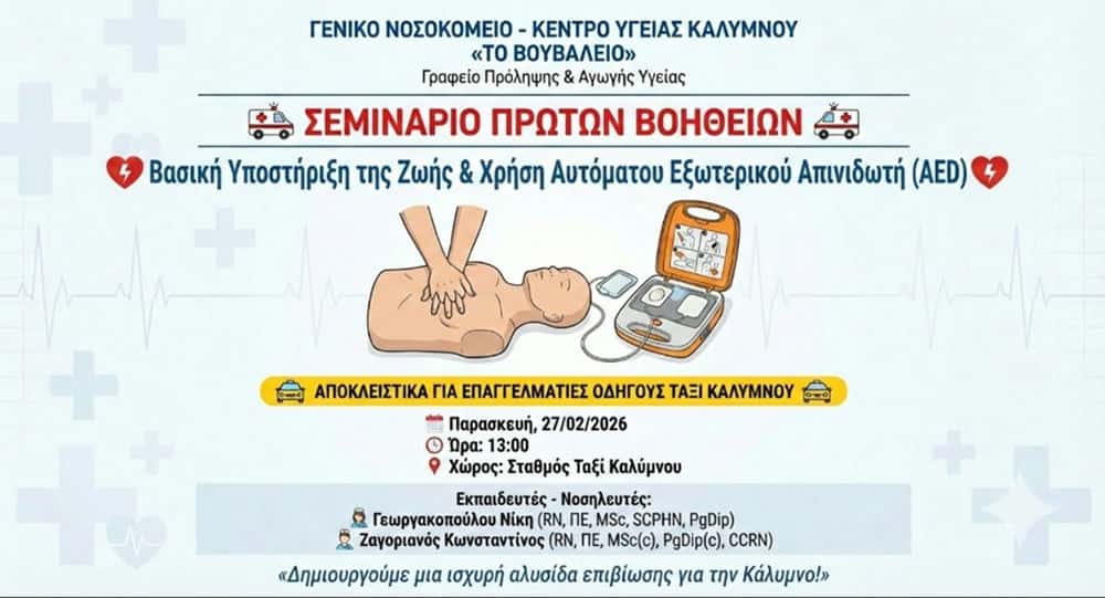 Την Παρασκευή 27 Φεβρουαρίου 2026, στις 13.00, το Γραφείο Πρόληψης & Αγωγής Υγείας του Γ.Ν. – Κ.Υ. Καλύμνου «Το Βουβάλειο» διοργανώνει εκπαιδευτικό σεμινάριο με θέμα τη Βασική Υποστήριξη της Ζωής (BLS) και τη Χρήση Αυτόματου Εξωτερικού Απινιδωτή (AED), το οποίο απευθύνεται αποκλειστικά στους επαγγελματίες οδηγούς ταξί του νησιού.