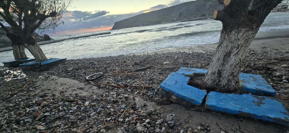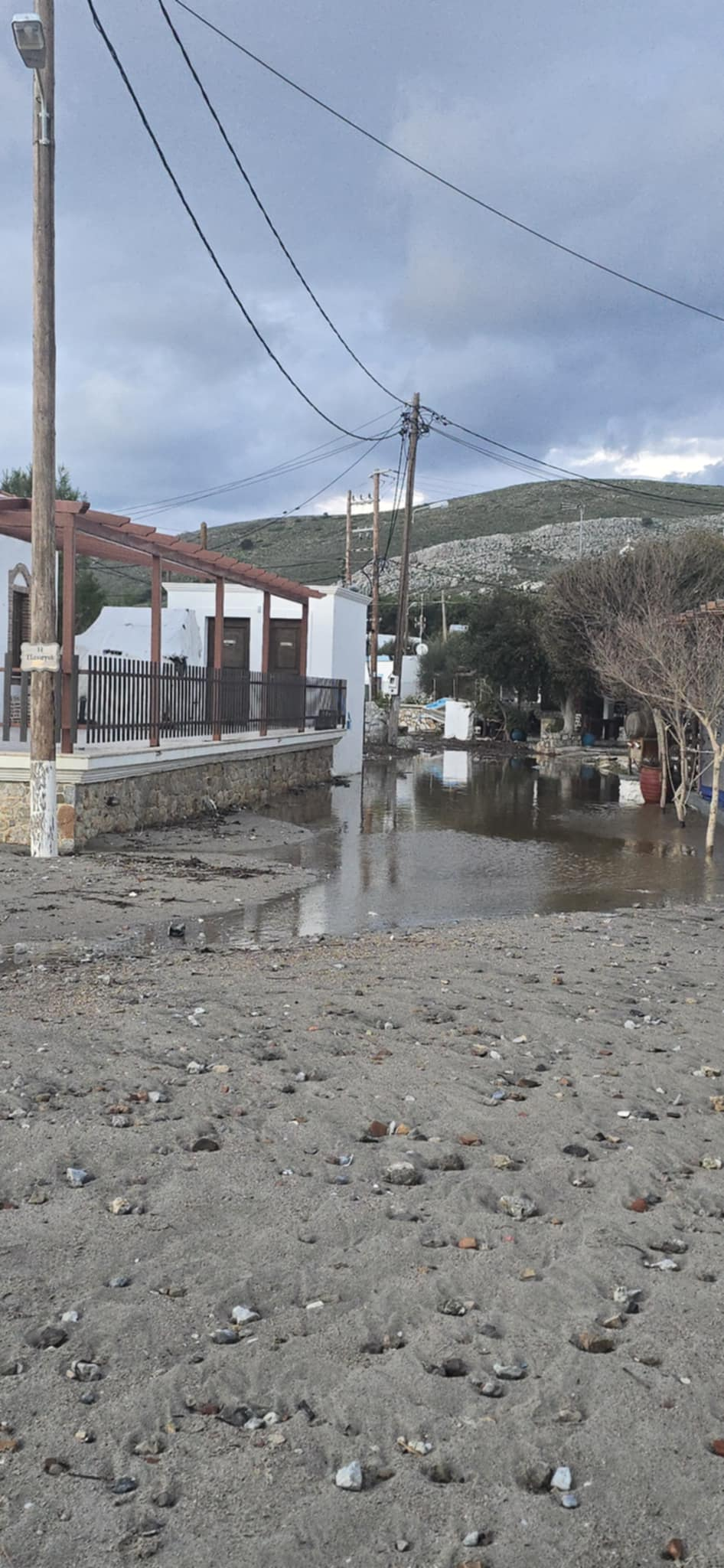 Η παραλία γέμισε με φερτά υλικά, ξύλα και θαλάσσια απορρίμματα που ξέβρασε το κύμα. Παράλληλα, οι μικροί δρόμοι του νησιού πλημμύρισαν, δυσχεραίνοντας τις μετακινήσεις των λιγοστών κατοίκων και προκαλώντας ανησυχία για την έκταση των ζημιών.