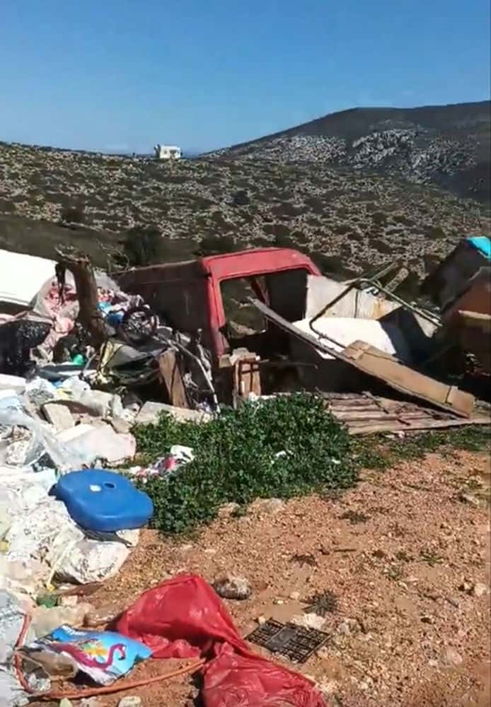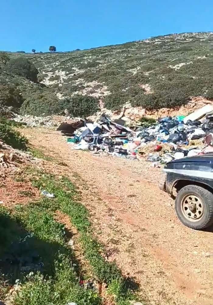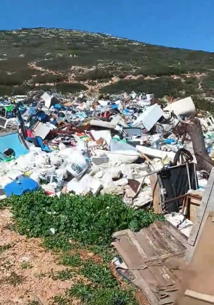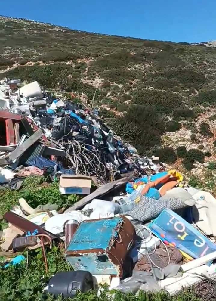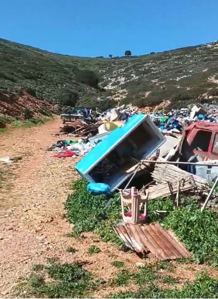 Η κάμερα κινείται αργά, αποτυπώνοντας το εύρος της έκτασης που έχει καλυφθεί από σκουπίδια, δίνοντας μια σαφή εικόνα της συσσώρευσης που έχει προκύψει από τη μακροχρόνια αδυναμία αποκομιδής. Δεν πρόκειται για μεμονωμένα απορρίμματα, αλλά για μια διαρκώς επεκτεινόμενη χωματερή, που αλλοιώνει το φυσικό τοπίο ενός μικρού και ευαίσθητου νησιωτικού περιβάλλοντος.