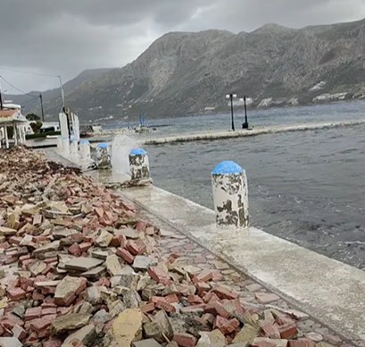 Οι θυελλώδεις άνεμοι και τα πελώρια κύματα που χτύπησαν με ορμή το παραλιακό μέτωπο του νησιού είχαν ως αποτέλεσμα να διασκορπιστούν σωροί από μπάζα, τα οποία είχαν συγκεντρωθεί στο πλαίσιο έργου αντικατάστασης του παλαιού λιθόστρωτου. Το έργο, που ξεκίνησε με στόχο την αναβάθμιση της εικόνας και της λειτουργικότητας της κατά τα άλλα μαγευτικής παραλίας της Τελένδου, φαίνεται πως βρέθηκε αντιμέτωπο με τις δυνάμεις της φύσης, αποκαλύπτοντας ωστόσο και σοβαρές ελλείψεις στον τρόπο διαχείρισης των υλικών που προέκυψαν από τις εργασίες.