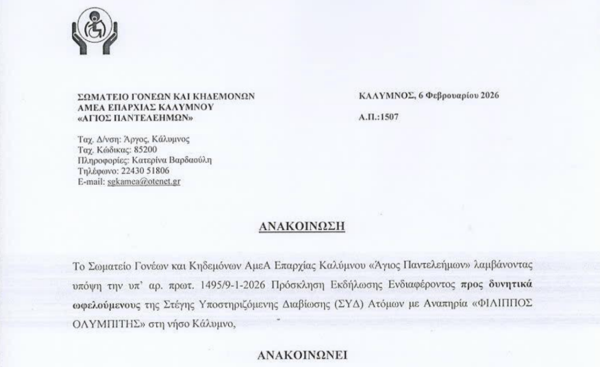 Την παράταση της προθεσμίας υποβολής αιτήσεων για τους υποψήφιους ωφελούμενους της Στέγης Υποστηριζόμενης Διαβίωσης (ΣΥΔ) Ατόμων με Αναπηρία «ΦΙΛΙΠΠΟΣ ΟΛΥΜΠΙΤΗΣ» στην Κάλυμνο ανακοίνωσε το Σωματείο Γονέων και Κηδεμόνων ΑμεΑ Επαρχίας Καλύμνου «Άγιος Παντελεήμων». Η νέα καταληκτική ημερομηνία ορίζεται η Τρίτη 31 Μαρτίου 2026, στο πλαίσιο της Πράξης που υλοποιείται μέσω του Προγράμματος «Νότιο Αιγαίο 2021-2027»