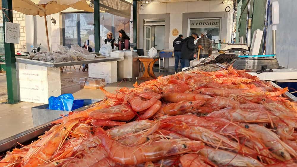 Οι βιτρίνες ήταν γεμάτες με εκλεκτά εδέσματα της θάλασσας, καλύπτοντας κάθε γευστική προτίμηση αλλά και κάθε οικονομική δυνατότητα. Χταπόδια για ψήσιμο στα κάρβουνα ή για παραδοσιακό ξιδάτο μεζέ, καλαμάρια και σουπιές ιδανικά για τηγάνι, σχάρα ή στιφάδο, γαρίδες μικρές και μεγάλες για σαγανάκι και μακαρονάδες, καθώς και ποικιλία οστρακοειδών – κυδώνια, μύδια και γυαλιστερές – συνέθεταν την πλούσια εικόνα των πάγκων.