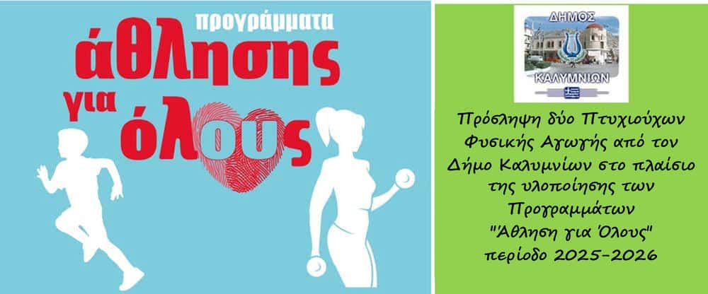 Στην πρόσληψη δύο (2) Πτυχιούχων Φυσικής Αγωγής προχωρά ο Δήμος Καλυμνίων, στο πλαίσιο της υλοποίησης των Προγραμμάτων «Άθληση για Όλους» για την περίοδο 2025-2026.