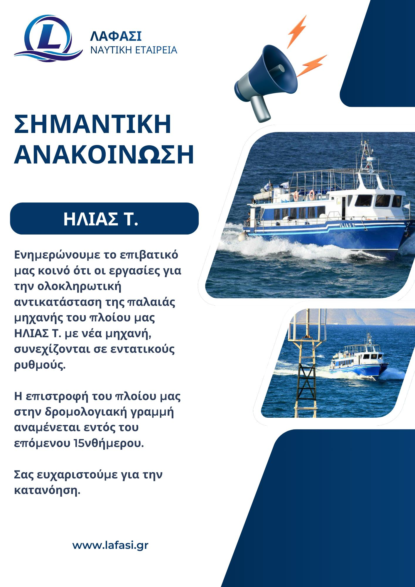 Η ΛΑΦΑΣΙ ΝΕ ευχαριστεί το επιβατικό κοινό για την κατανόηση και την υπομονή που επιδεικνύει κατά τη διάρκεια των εργασιών, υπογραμμίζοντας ότι καταβάλλεται κάθε δυνατή προσπάθεια για την ταχύτερη επαναφορά του πλοίου στα δρομολόγια.