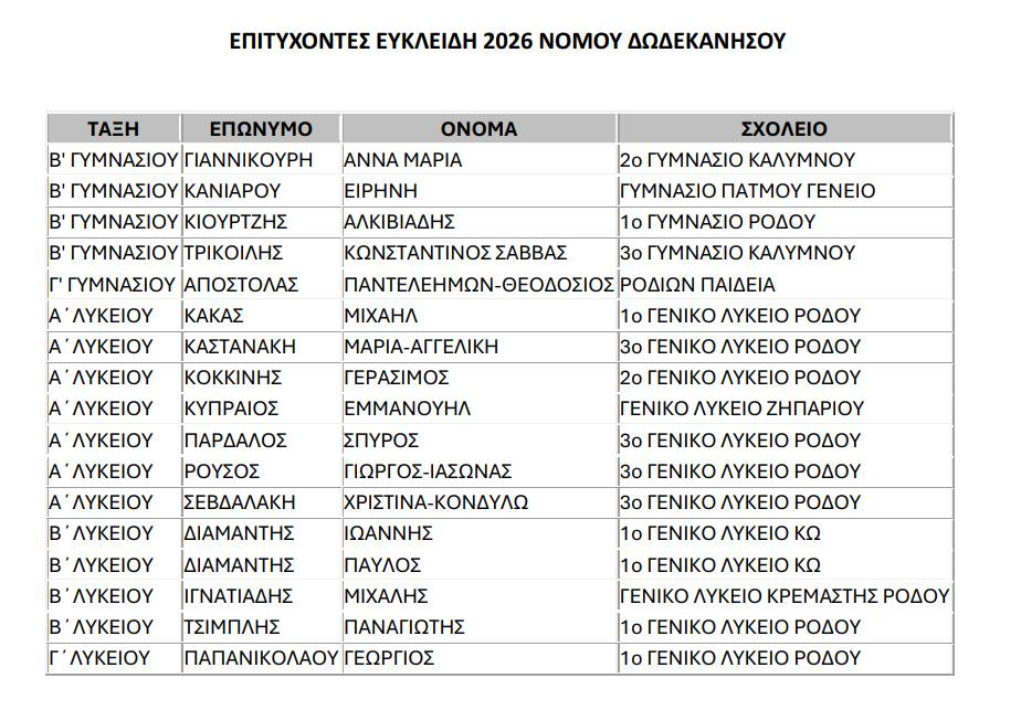 Σημαντική επιτυχία για τη μαθητική κοινότητα της Δωδεκανήσου καταγράφεται μετά την ανακοίνωση των αποτελεσμάτων του διαγωνισμού «Ο Ευκλείδης», που πραγματοποιήθηκε στις 17 Ιανουαρίου 2026.