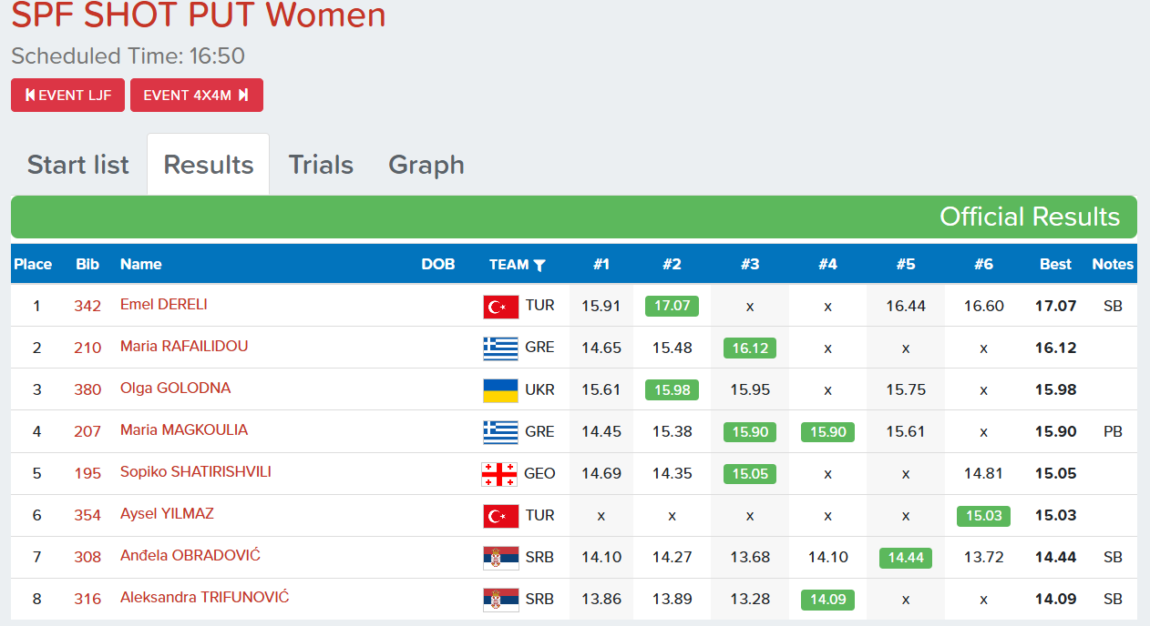 Η Καλυμνιά πρωταθλήτρια πραγματοποίησε μια ιδιαίτερα αξιόλογη εμφάνιση, με καλύτερη βολή στα 15,90 μέτρα, επίδοση που της χάρισε την 4η θέση στη διοργάνωση. Μια τιμητική διάκριση που επιβεβαιώνει τη σταθερότητα και το υψηλό αγωνιστικό της επίπεδο, εκπροσωπώντας επάξια τόσο την Κάλυμνο όσο και τα ελληνικά χρώματα.
