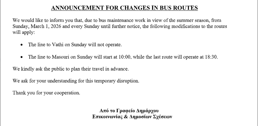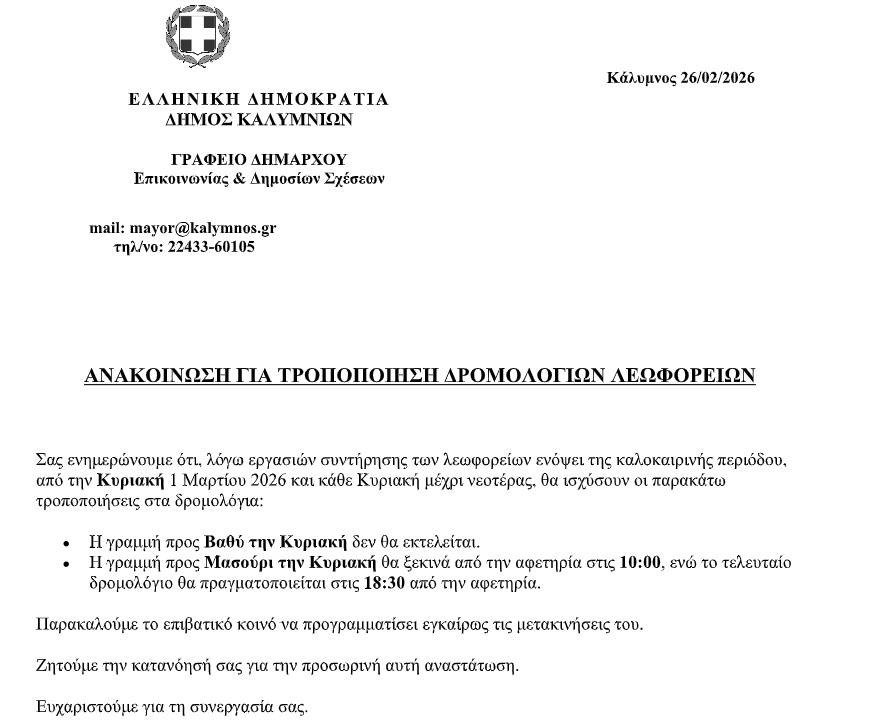 Αλλαγές στα δρομολόγια των δημοτικών λεωφορείων θα ισχύσουν από την Κυριακή 1 Μαρτίου 2026 και κάθε Κυριακή μέχρι νεοτέρας, σύμφωνα με ανακοίνωση του Δήμος Καλυμνίων. Οι τροποποιήσεις κρίνονται απαραίτητες λόγω εργασιών συντήρησης των λεωφορείων ενόψει της καλοκαιρινής περιόδου και αφορούν τις γραμμές προς Βαθύ και Μασούρι. Οι πολίτες καλούνται να προγραμματίσουν έγκαιρα τις μετακινήσεις τους, καθώς η γραμμή προς Βαθύ δεν θα εκτελείται τις Κυριακές, ενώ η γραμμή προς Μασούρι θα λειτουργεί με περιορισμένο ωράριο