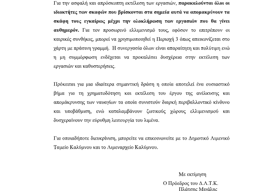 Το Δημοτικό Λιμενικό Ταμείο Καλύμνου ενημερώνει τους ιδιοκτήτες σκαφών που ελλιμενίζονται σε συγκεκριμένα σημεία του λιμένα Πόθιας ότι τη Δευτέρα 9 Φεβρουαρίου 2026 θα πραγματοποιηθούν εργασίες βυθομετρίας, στο πλαίσιο τεχνικής μελέτης για τη χαρτογράφηση και την ανέλκυση ναυαγίων. Για την ομαλή και ασφαλή διεξαγωγή των εργασιών απαιτείται η έγκαιρη απομάκρυνση των σκαφών από τις καθορισμένες περιοχές.