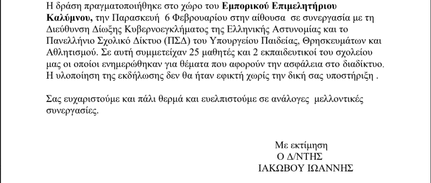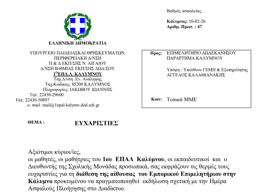 Με την παρακάτω επιστολή, η σχολική κοινότητα του 1ου ΕΠΑΛ Καλύμνου εκφράζει τις θερμές της ευχαριστίες προς το Επιμελητήριο Δωδεκανήσου – Παράρτημα Καλύμνου, για την πολύτιμη υποστήριξη και τη διάθεση της αίθουσας του Εμπορικού Επιμελητηρίου, προκειμένου να πραγματοποιηθεί με επιτυχία εκπαιδευτική εκδήλωση αφιερωμένη στην Ημέρα Ασφαλούς Πλοήγησης στο Διαδίκτυο.