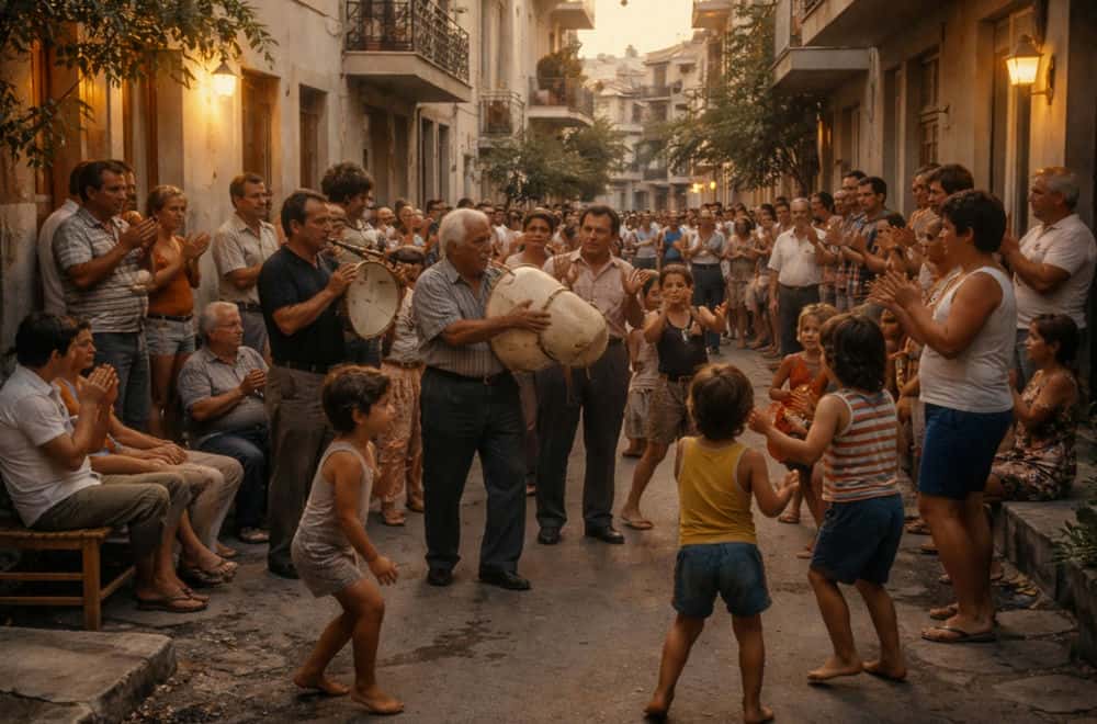 Μέχρι έξω τον δρόμο ο κόσμος χόρευε και τραγουδούσε και ο Τάλιας μπαινόβγαινε απο το σπίτι στην αυλή και μετά στο δρόμο,φουσκώνοντας με πείσμα και μεράκι το τομάρι.Τι γέλια,τι φωνές πρόσχαρες,τι τραγούδια,τι γελαστά πρόσωπα,τι πειράγματα…μικρό παιδί ήμουν και θυμάμαι να χώνομαι ανάμεσα στον κόσμο,ανάμεσα στο χορό και να γελώ κι εγώ μαζί τους και να κάνω αστεία βήματα και άτεχνα προσπαθώντας να μιμηθώ τους μεγάλους στο χορό,τραβώντας και τα αδέρφια μου και τους φίλους μου από το χέρι.