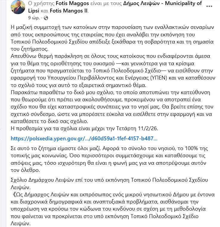 Ο Δήμαρχος Λειψών, Φώτης Μάγγος, απευθύνει ανοιχτό κάλεσμα προς όλους τους δημότες να αξιοποιήσουν τη δυνατότητα δημόσιας διαβούλευσης μέσω της ειδικής εφαρμογής του Υπουργείου Περιβάλλοντος και Ενέργειας (ΥΠΕΝ), καταθέτοντας τα σχόλια και τις απόψεις τους εντός της προβλεπόμενης προθεσμίας. Όπως τονίζει, η ενεργή συμμετοχή των πολιτών αποτελεί το ισχυρότερο εργαλείο για να αποτραπούν επιλογές που ενδέχεται να έχουν δυσμενείς και μη αναστρέψιμες συνέπειες για την αναπτυξιακή προοπτική, την κοινωνική συνοχή και την ίδια την επιβίωση του νησιού.