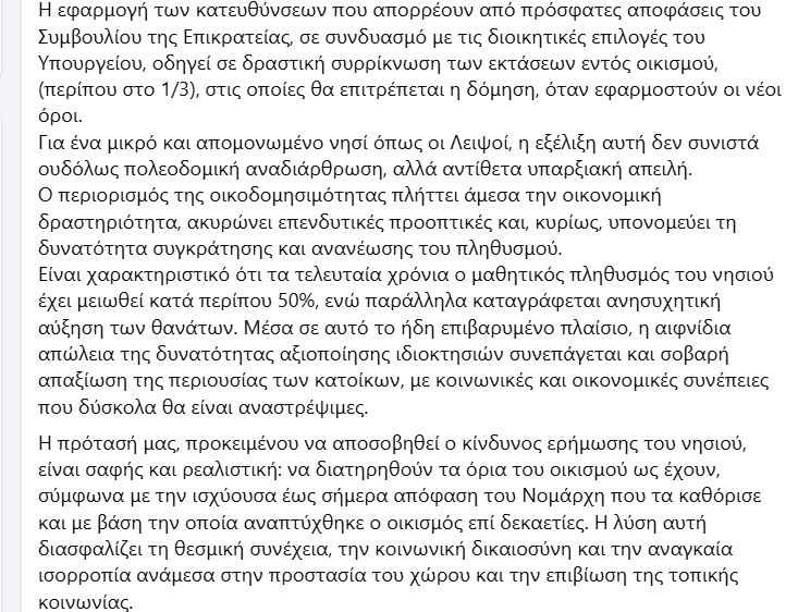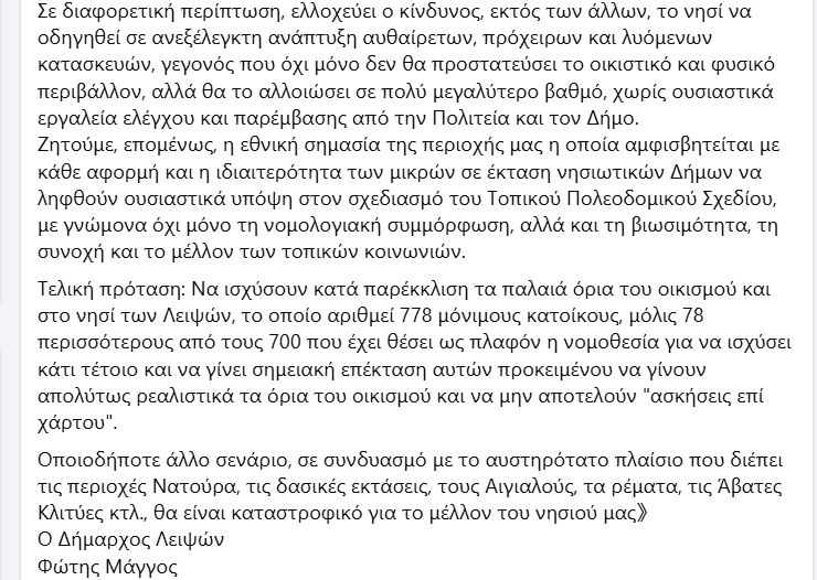 Στο πλαίσιο αυτό, ο Δήμαρχος δημοσιοποιεί και το δικό του αναλυτικό σχόλιο επί του ΤΠΣ, αποτυπώνοντας με σαφήνεια τη θέση της Δημοτικής Αρχής και την κατεύθυνση που, κατά την άποψή της, πρέπει να ακολουθηθεί. Πρόκειται για μια παρέμβαση που θέτει στο επίκεντρο τις ιδιαιτερότητες ενός μικρού, απομονωμένου νησιωτικού δήμου, τις δημογραφικές πιέσεις που αντιμετωπίζει και τον κίνδυνο ερήμωσης που μπορεί να ενταθεί από έναν ασφυκτικό και αποκομμένο από την πραγματικότητα πολεοδομικό σχεδιασμό.