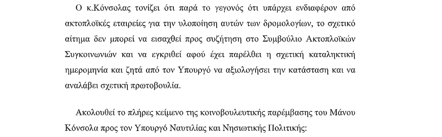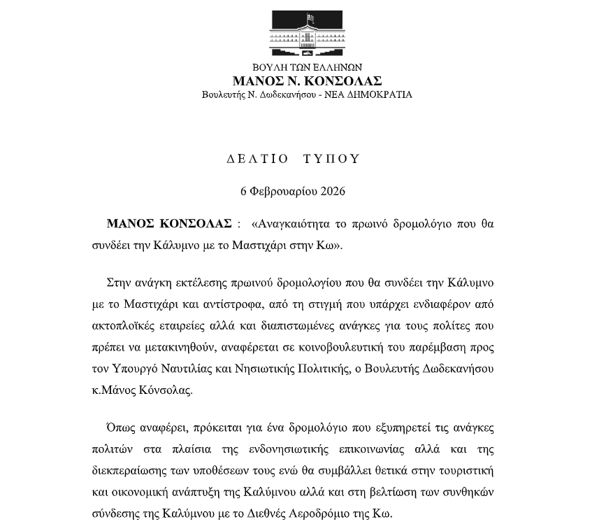 Στο πλαίσιο αυτό, ο Μάνος Κόνσολας προχώρησε σε κοινοβουλευτική παρέμβαση προς τον Υπουργό, επισημαίνοντας την αναγκαιότητα καθιέρωσης πρωινού δρομολογίου με αναχώρηση από την Κάλυμνο μεταξύ 06:30 και 06:45 το πρωί, χωρίς ενδιάμεση στάση στην Ψέριμο, ώστε να διασφαλίζεται η έγκαιρη και αξιόπιστη σύνδεση του νησιού με το Διεθνές Αεροδρόμιο της Κω, αλλά και η ουσιαστική εξυπηρέτηση των πολιτών, της τοπικής οικονομίας και της τουριστικής ανάπτυξης της Καλύμνου.
