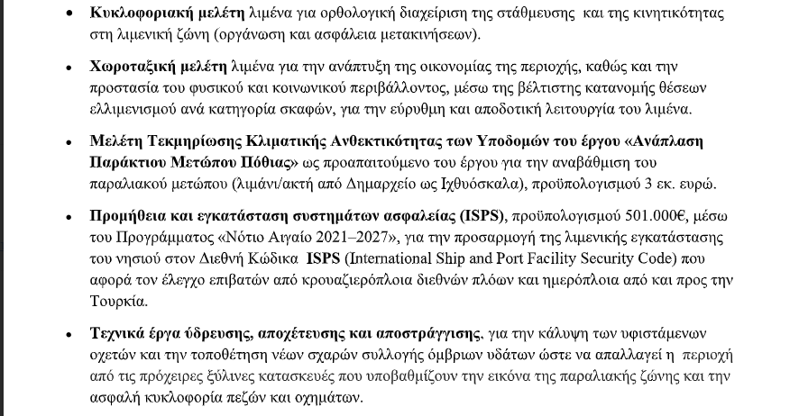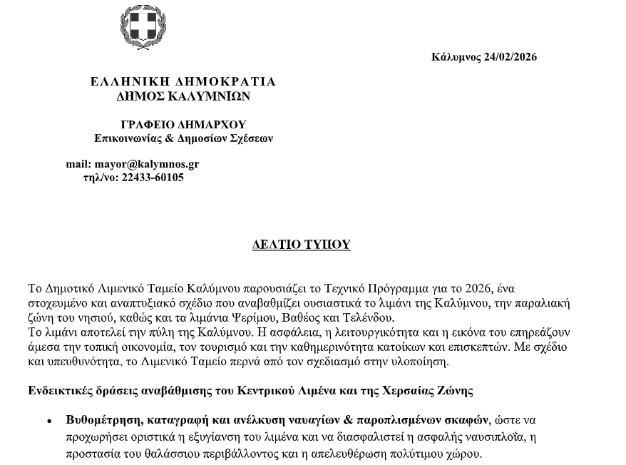 Ένα ολοκληρωμένο και στοχευμένο σχέδιο παρεμβάσεων για την αναβάθμιση του κεντρικού λιμένα και της παραλιακής ζώνης της Καλύμνου, καθώς και για τη θεσμική οργάνωση των λιμανιών Ψερίμου, Βαθέος και Τελένδου, θέτει σε εφαρμογή το Δημοτικό Λιμενικό Ταμείο στο πλαίσιο του Τεχνικού Προγράμματος για το 2026. Με έμφαση στην ασφάλεια, τη λειτουργικότητα, την περιβαλλοντική προστασία και την αναπτυξιακή προοπτική, η Δημοτική Αρχή προχωρά από τον σχεδιασμό στην υλοποίηση έργων που ενισχύουν την τοπική οικονομία, τον τουρισμό και την καθημερινότητα κατοίκων και επισκεπτών, διαμορφώνοντας ένα σύγχρονο και ανθεκτικό λιμάνι αντάξιο της ναυτικής ταυτότητας του νησιού.