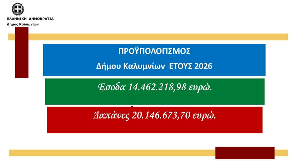 Σε ειδική συνεδρίαση συνήλθε το Δημοτικό Συμβούλιο Δήμου Καλυμνίων τη Δευτέρα 2 Φεβρουαρίου 2026, στην αίθουσα συνεδριάσεων του Δημοτικού Μεγάρου, με ώρα έναρξης 18:00 και μοναδικό θέμα ημερήσιας διάταξης την «Έγκριση Προϋπολογισμού Δήμου Καλυμνίων οικονομικού έτους 2026».