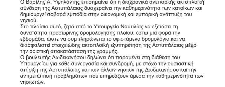 Παρέμβαση Βασίλη Α. Υψηλάντη για την ενίσχυση της ακτοπλοϊκής σύνδεσης της Αστυπάλαιας