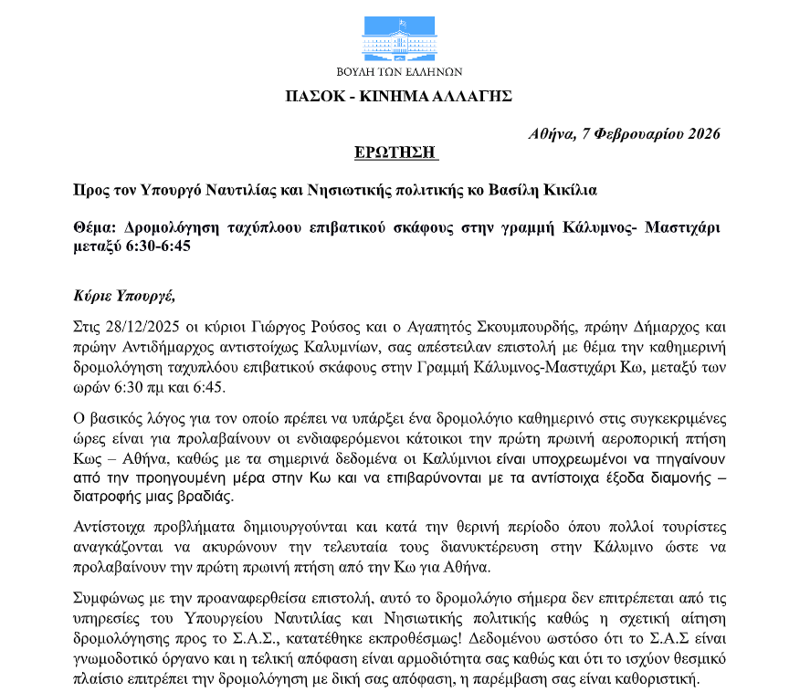 Το κρίσιμο ζήτημα της καθημερινής δρομολόγησης ταχυπλόου επιβατικού σκάφους στη γραμμή Κάλυμνος – Μαστιχάρι Κω στο χρονικό πλαίσιο 06:30 π.μ. – 06:45 π.μ., φέρνει στη Βουλή ο Βουλευτής Δωδεκανήσου του ΠΑΣΟΚ και υπεύθυνος του ΚΤΕ Ανάπτυξης Γιώργος Νικητιάδης, με Ερώτησή του προς τον Υπουργό Ναυτιλίας και Νησιωτικής Πολιτικής, κ. Βασίλη Κικίλια. Η Ερώτηση κατατέθηκε το Σάββατο 07 Φεβρουαρίου 2026.