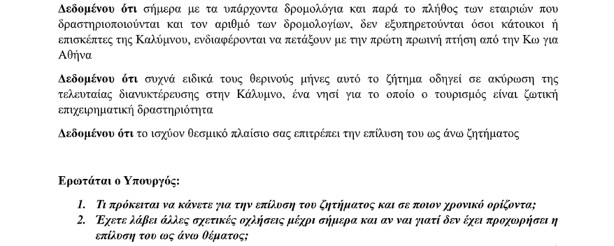 Ο κ. Νικητιάδης, στην Ερώτησή του, επισημαίνει ότι σήμερα υπάρχει σαφές κενό στην πρωινή ακτοπλοϊκή σύνδεση Καλύμνου – Κω, με αποτέλεσμα οι Καλύμνιοι να μην μπορούν να εξυπηρετηθούν για την πρώτη πρωινή αεροπορική πτήση Κως – Αθήνα. Έτσι, με τα σημερινά δεδομένα, πολλοί κάτοικοι αναγκάζονται να μεταβαίνουν στην Κω από την προηγούμενη ημέρα, επιβαρυνόμενοι με έξοδα διαμονής και διατροφής, προκειμένου να μην χάσουν την πτήση.