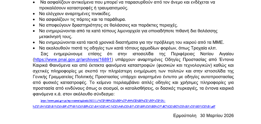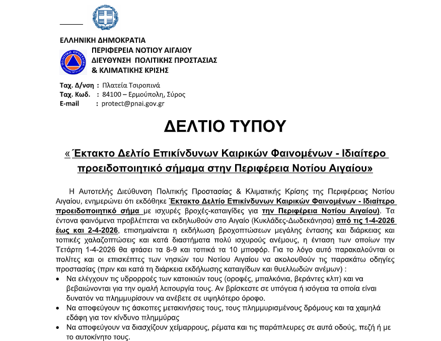 Από την Πολιτική Προστασία της Περιφέρειας Νοτίου Αιγαίου εκδόθηκε Έκτακτο δελτίο επικίνδυνων καιρικών φαινομένων στις Τετάρτη και Πέμπτη 1 & 2 Απριλίου με βροχοπτώσεις, χαλαζοπτώσεις και πολύ ισχυρούς ανέμους