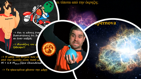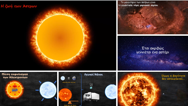 Στο πλαίσιο της διαδραστικής παρουσίασης, αναλύθηκε ενδελεχώς η εξελικτική πορεία των αστέρων, η οποία διέπεται από μια αέναη, κοσμική πάλη μεταξύ της θερμοπυρηνικής σύντηξης και της βαρυτικής κατάρρευσης. Όπως αποσαφηνίστηκε, τα άστρα γεννιούνται σε αχανείς περιοχές αστρογένεσης –τα γιγαντιαία μοριακά νέφη– όπου η βαρυτική συμπύκνωση της ύλης πυροδοτεί την έναρξη της ζωής τους. Ιδιαίτερη έμφαση δόθηκε στην εξάντληση των πυρηνικών αποθεμάτων αστέρων μεσαίας μάζας, όπως ο Ήλιος μας, γεγονός που οδηγεί στον κβαντικό εκφυλισμό των ηλεκτρονίων.