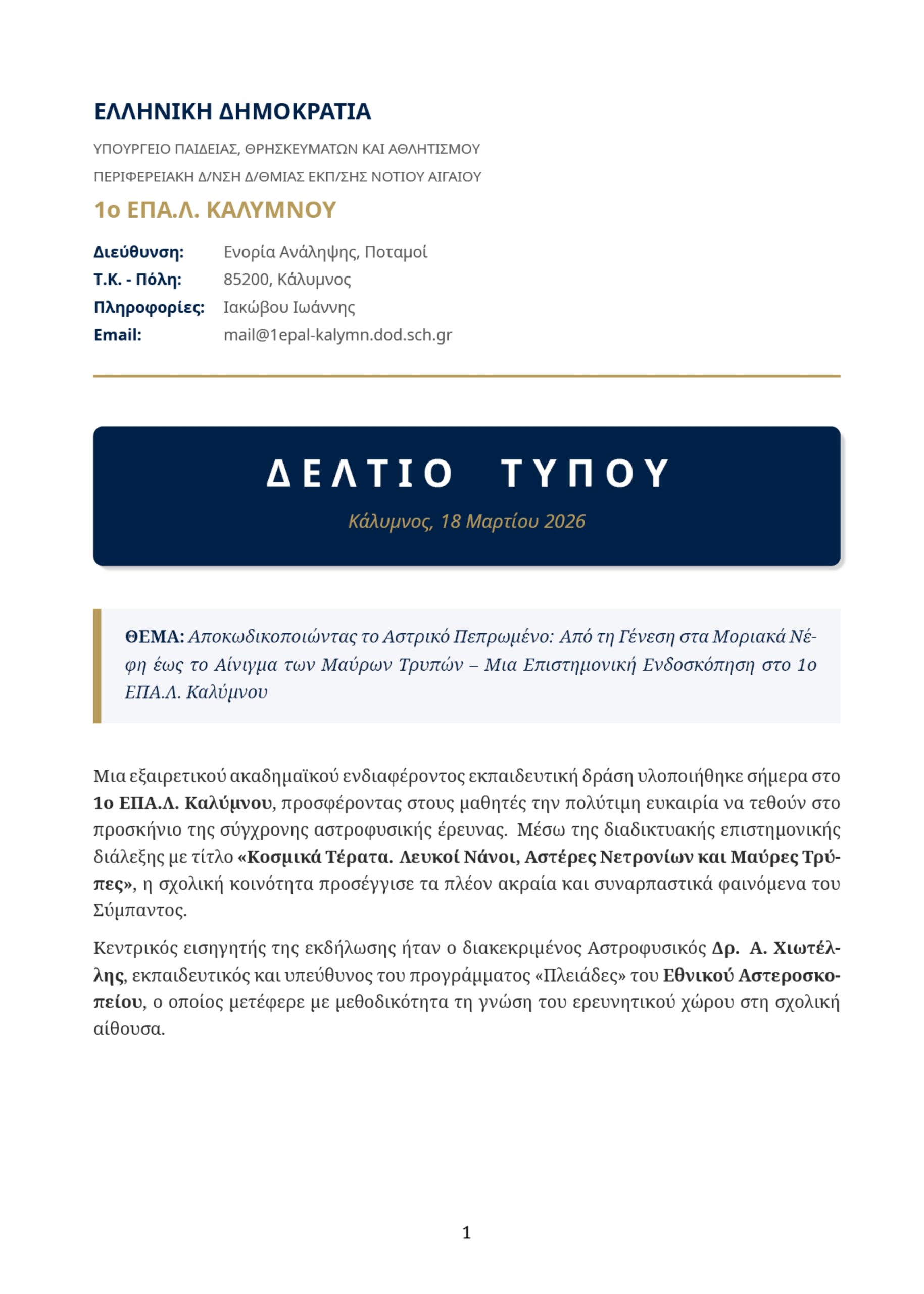 Μια εξαιρετικού ακαδημαϊκού ενδιαφέροντος εκπαιδευτική δράση υλοποιήθηκε σήμερα στο 1ο ΕΠΑ.Λ. Καλύμνου, προσφέροντας στους μαθητές την πολύτιμη ευκαιρία να τεθούν στο προσκήνιο της σύγχρονης αστροφυσικής έρευνας. Μέσω της διαδικτυακής επιστημονικής ημερίδας με τίτλο «Η Ζωή των Άστρων: Από τα Μοριακά Νέφη στην Αστρική Σκόνη», η σχολική κοινότητα προσέγγισε τα πλέον ακραία και συναρπαστικά φαινόμενα του Σύμπαντος.