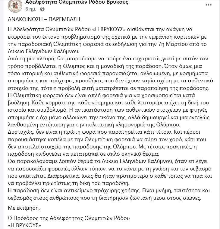 Ο Πρόεδρος της Αδελφότητας Ολυμπιτών Ρόδου «Η Βρυκούς», Αντώνης Μηνά Κωστάκης θεώρησε ότι η παρουσίαση της Ολυμπίτικης φορεσιάς εμφανίστηκε αλλοιωμένη, και προέβη σε δημόσια ανάρτηση , στη σελίδα της Αδελφότητας στο Facebook. Η παρέμβαση, με εμφανώς επικριτικό ύφος και αιχμές για την παρουσίαση της φορεσιάς, προκάλεσε έντονη ενόχληση στο Λύκειο Ελληνίδων Καλύμνου, το οποίο απάντησε με επιστολή της Προέδρου του Διοικητικού Συμβουλίου Καλλιόπης Κασσάρα – Τρικοίλη.