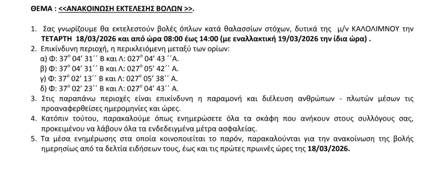 Βολές όπλων κατά θαλάσσιων στόχων πρόκειται να πραγματοποιηθούν δυτικά της νήσου “Καλόλιμνος την Τετάρτη 18 Μαρτίου 2026, σύμφωνα με σχετική ανακοίνωση των αρμόδιων αρχών.