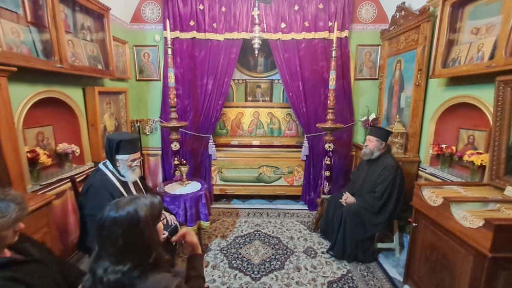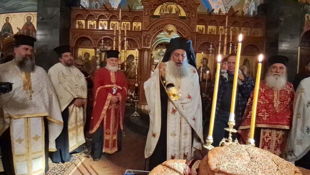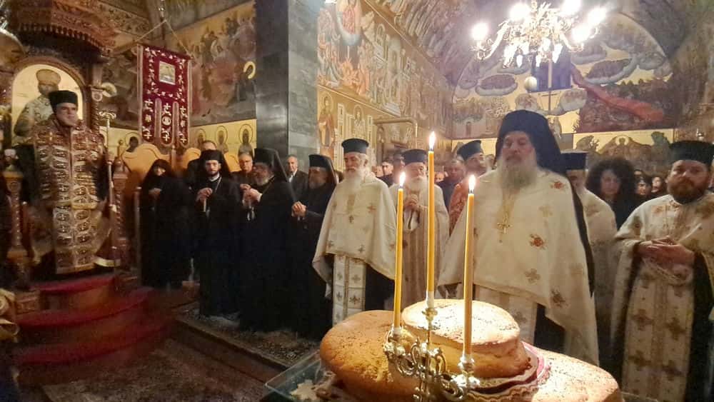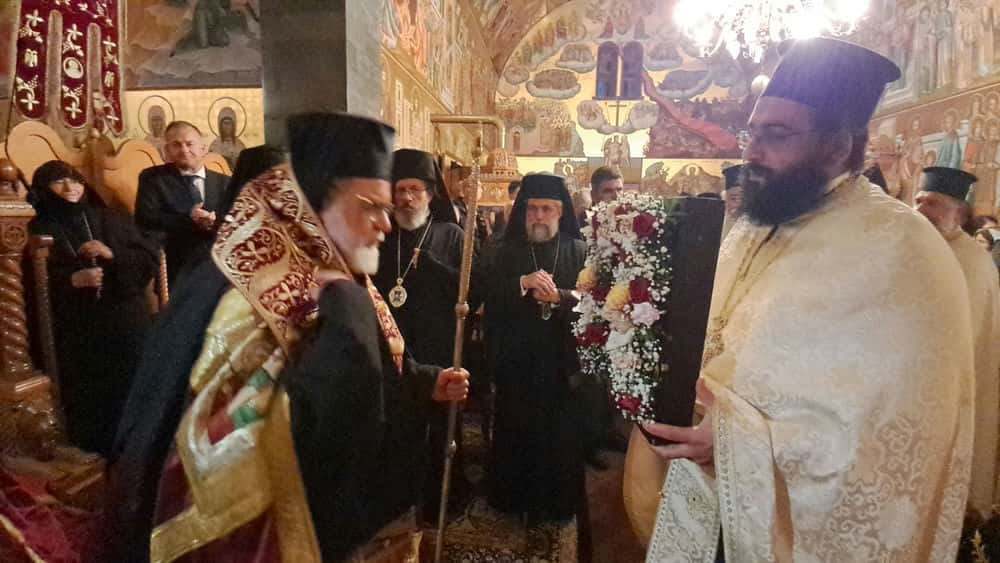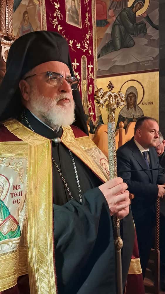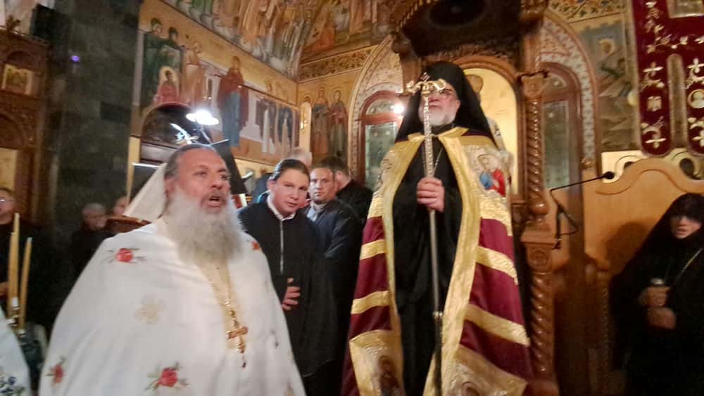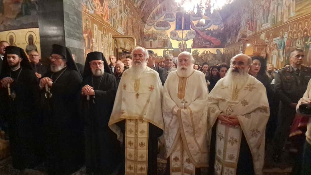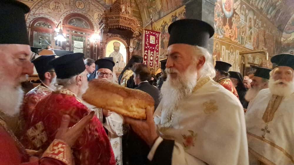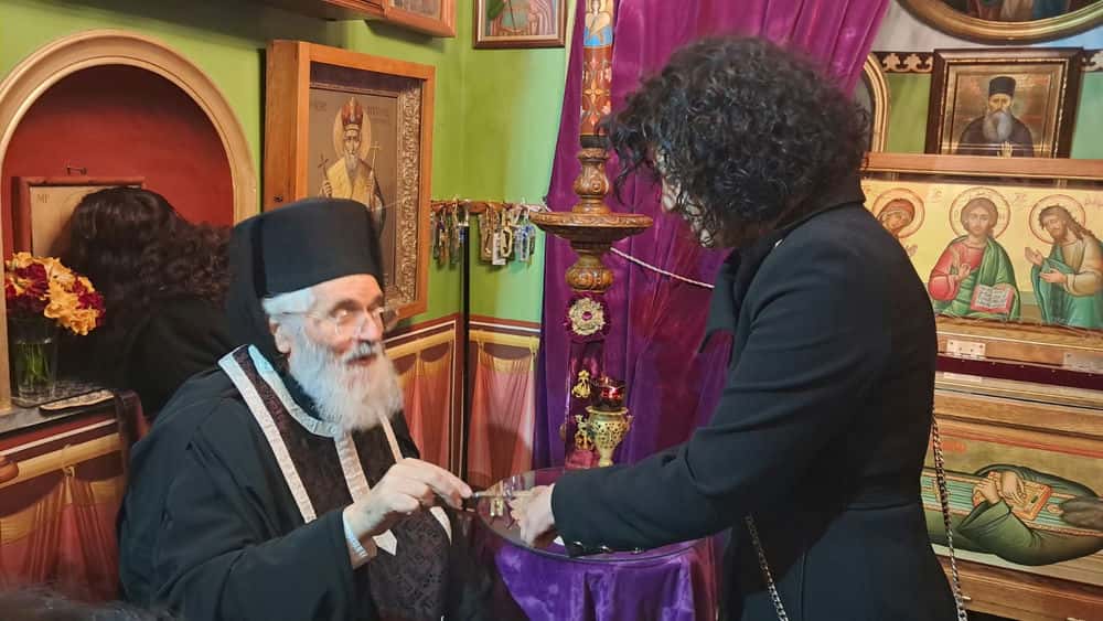 Ο Σεβασμιότατος μητροπολίτης κ. Παϊσιος καθόλη τη διάρκεια του Εσπερινού παρέμεινε στο χώρο όπου φυλάσσεται το σκήνωμα ττου Οσίου Σάββα, μυρώνοντας τους προσκυνητές