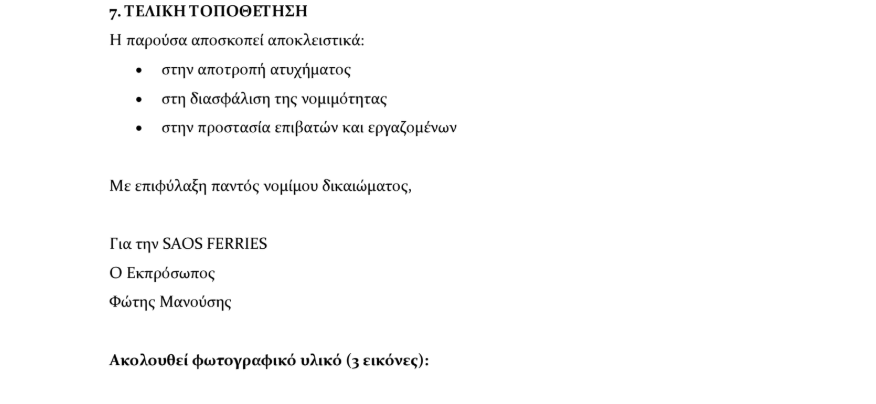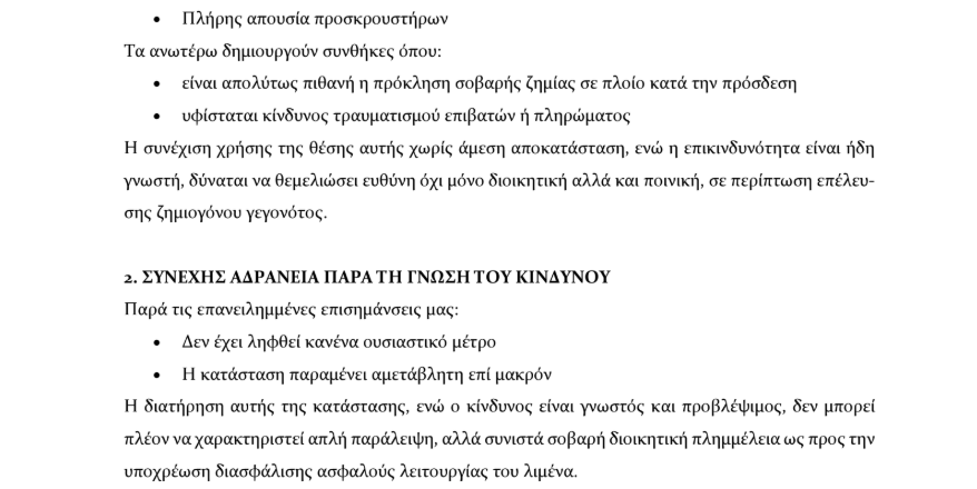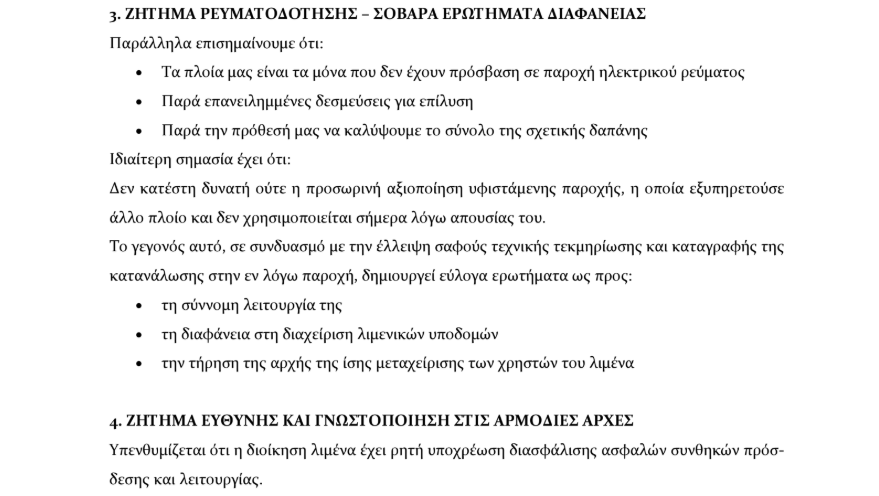 Η εταιρεία επισημαίνει εκτεταμένες φθορές στον προβλήτα, απουσία βασικών υποδομών πρόσδεσης και άνιση μεταχείριση ως προς την ηλεκτροδότηση των πλοίων της, ενώ προειδοποιεί ακόμη και με αποχώρηση από το νησί με ελλιμενισμό στο Πυθαγόρειο Σάμου εάν δεν ληφθούν άμεσα μέτρα. Παράλληλα, θέτει ζήτημα ευθυνών της διοίκησης, κοινοποιώντας την επιστολή στην Ιεραρχία του Υπουργείου Ναυτιλίας και Νησιωτικής Πολιτικής καθώς και στην Εισαγγελία Πρωτοδικών Κω.