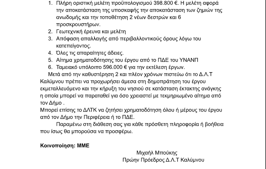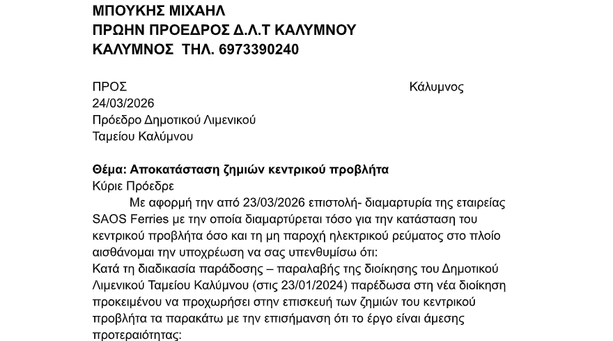 Την άμεση κινητοποίηση της διοίκησης του Δημοτικού Λιμενικού Ταμείου Καλύμνου για την αποκατάσταση των σοβαρών ζημιών στον κεντρικό προβλήτα ζητά με επιστολή του ο πρώην πρόεδρος του Δ.Λ.Τ. Καλύμνου, Μιχάλης Μπούκης.