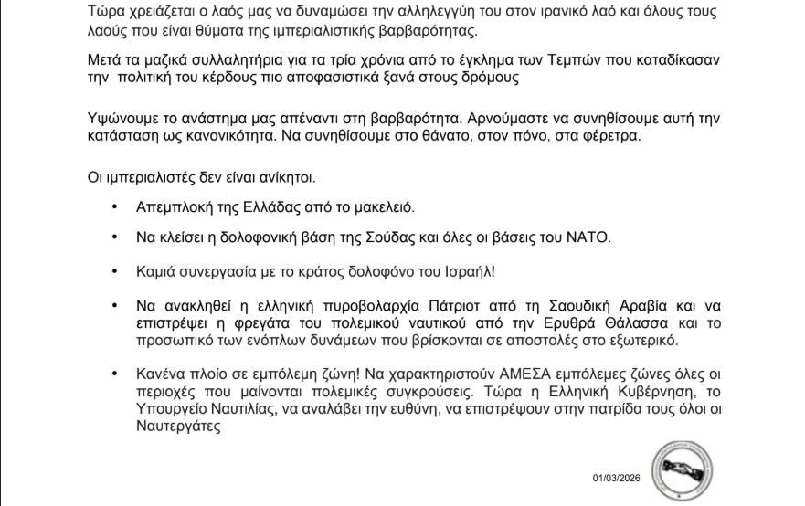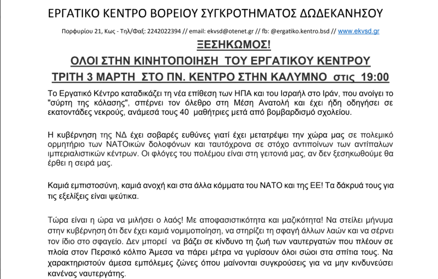 Το Εργατικό Κέντρο διοργανώνει αντιπολεμική συγκέντρωση την Τρίτη 3 Μαρτίου 2026 στις 19.00 στην Κάλυμνο.