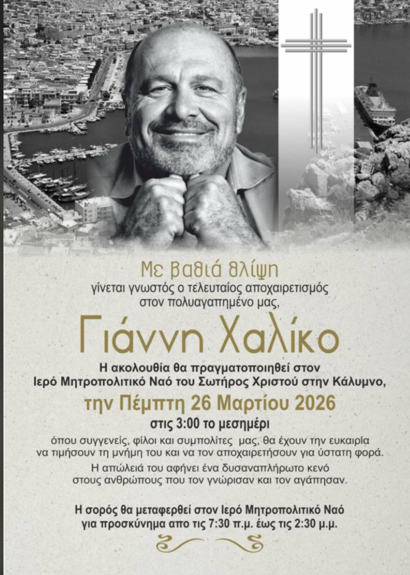 Το τελευταίο “αντίο” στο μεγάλο ευεργέτη Γιάννη Χαλίκο την Πέμπτη 26 Μαρτίου 2026 στην Κάλυμνο. – Η επίσημη ανακοίνωση για τη νεκρώσιμη ακολουθία