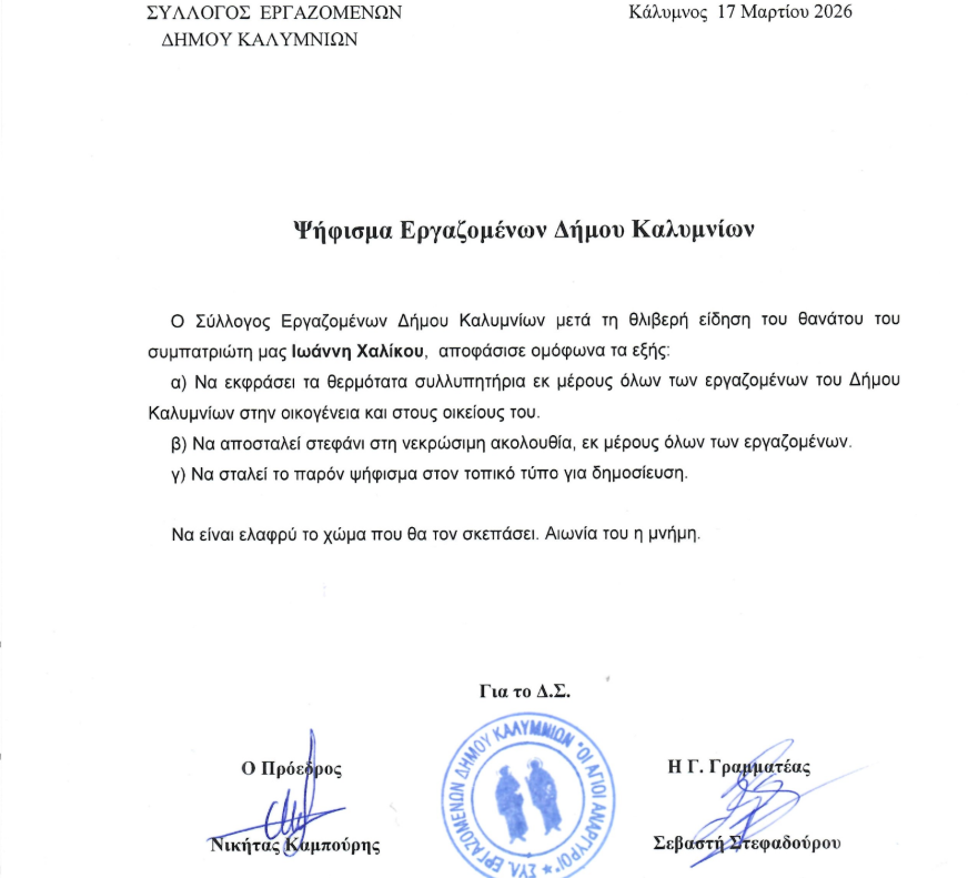 Με αισθήματα βαθιάς θλίψης, οι εργαζόμενοι του Δήμου Καλυμνίων εξέδωσαν ψήφισμα για την απώλεια του μεγάλου ευεργέτη της Καλύμνου Ιωάννη Χαλικού, εκφράζοντας τα ειλικρινή τους συλλυπητήρια και τιμώντας τη μνήμη του.