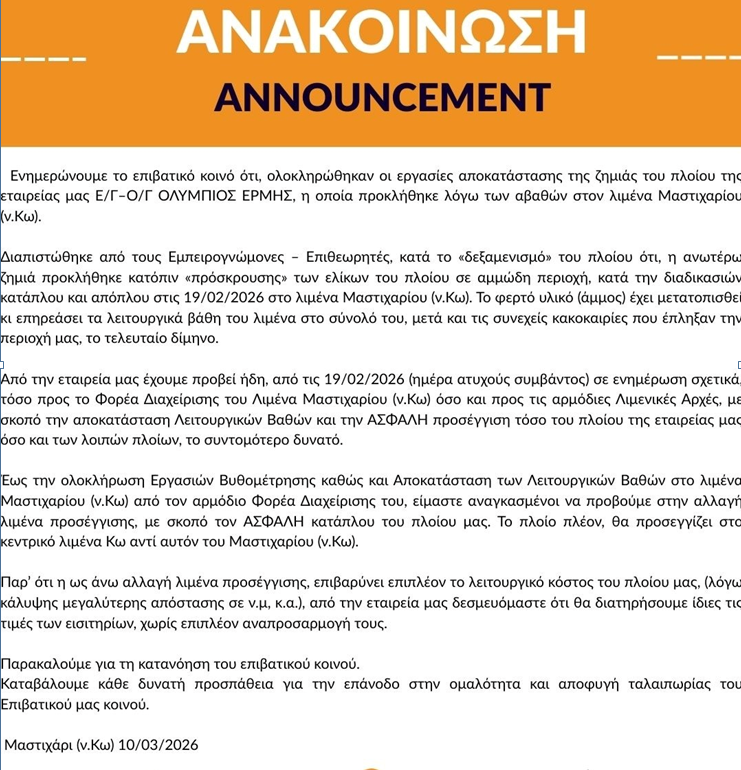 Σε ανακοίνωσή της, η Ανώνυμη Ναυτιλιακή Εταιρεία Μαστιχαρίου ενημερώνει το επιβατικό κοινό ότι ολοκληρώθηκαν οι εργασίες αποκατάστασης της ζημιάς στο πλοίο Ε/Γ–Ο/Γ «Ολύμπιος Ερμής», η οποία προκλήθηκε στον έλικα σε αμμώδη περιοχή λόγω των μικρών βαθών στο λιμάνι Μαστιχαρίου στις 19 Φεβρουαρίου 2026.