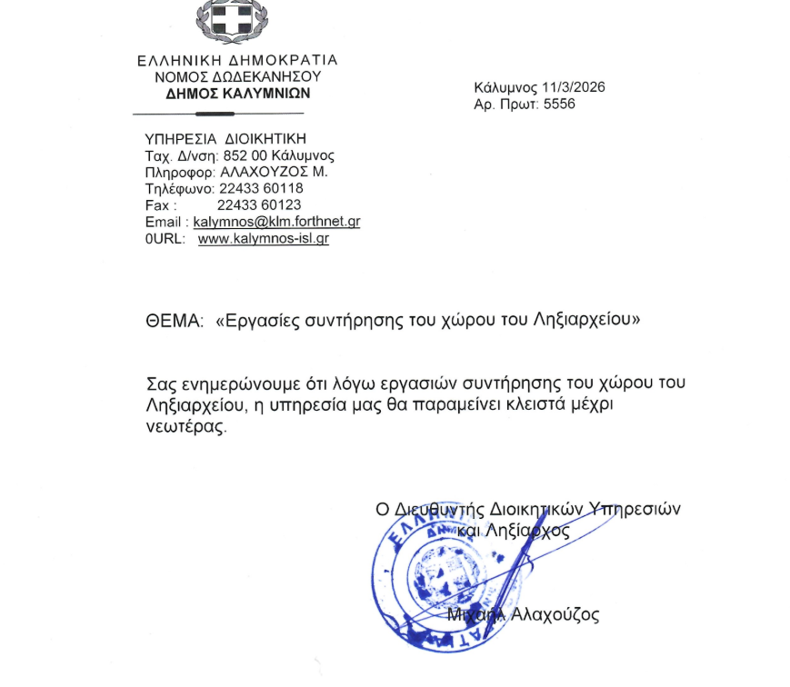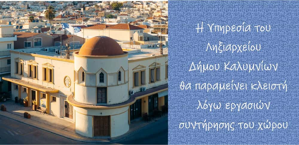Η Υπηρεσία του Ληξιαρχείου Δήμου Καλυμνίων θα παραμείνει κλειστή μέχρι νεωτέρας λόγω εργασιών συντήρησης του χώρου