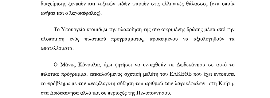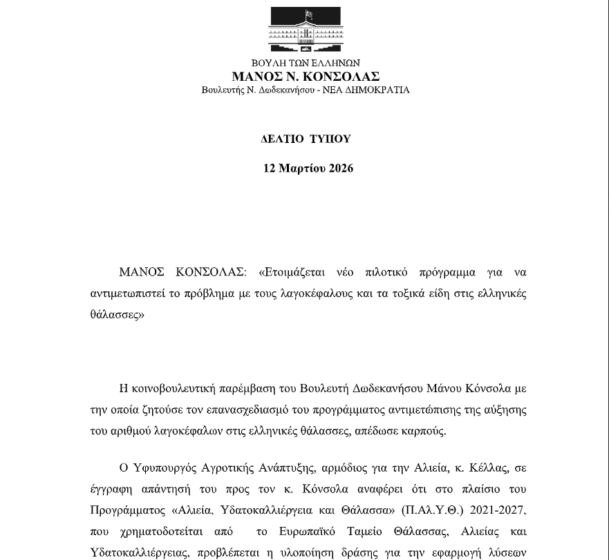 Την προετοιμασία νέου πιλοτικού προγράμματος για την αντιμετώπιση της εξάπλωσης των λαγοκέφαλων και άλλων τοξικών ξενικών ειδών στις ελληνικές θάλασσες ανακοίνωσε το Υπουργείο Αγροτικής Ανάπτυξης, μετά από κοινοβουλευτική παρέμβαση του βουλευτή Δωδεκανήσου Μάνου Κόνσολα. Το πρόγραμμα, που εντάσσεται στο πλαίσιο του «Αλιεία, Υδατοκαλλιέργεια και Θάλασσα 2021-2027», αναμένεται να εφαρμοστεί πιλοτικά ώστε να αξιολογηθούν οι δυνατότητες διαχείρισης του προβλήματος, το οποίο επηρεάζει έντονα περιοχές όπως τα Δωδεκάνησα.