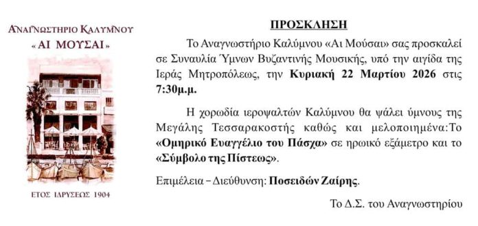 Συναυλία αφιερωμένη στους ύμνους της Μεγάλης Τεσσαρακοστής διοργανώνει το Αναγνωστήριο «ΑΙ ΜΟΥΣΑΙ», την ερχόμενη Κυριακή 22 Μαρτίου και ώρα 7:30 το απόγευμα, στο ισόγειο του Πνευματικού Κέντρου.