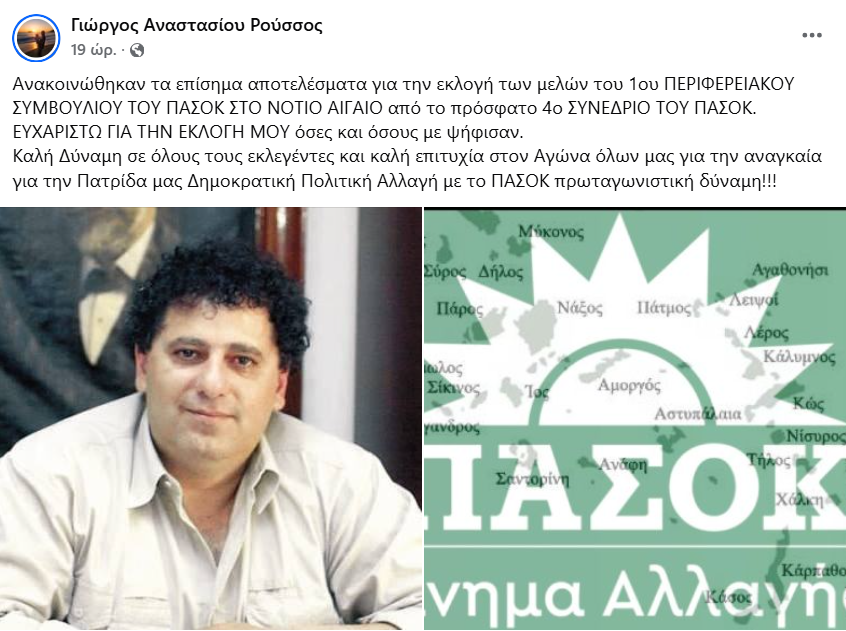 «Ανακοινώθηκαν τα επίσημα αποτελέσματα για την εκλογή των μελών του 1ου Περιφερειακού Συμβουλίου του ΠΑΣΟΚ στο Νότιο Αιγαίο από το πρόσφατο 4ο Συνέδριο του ΠΑΣΟΚ.