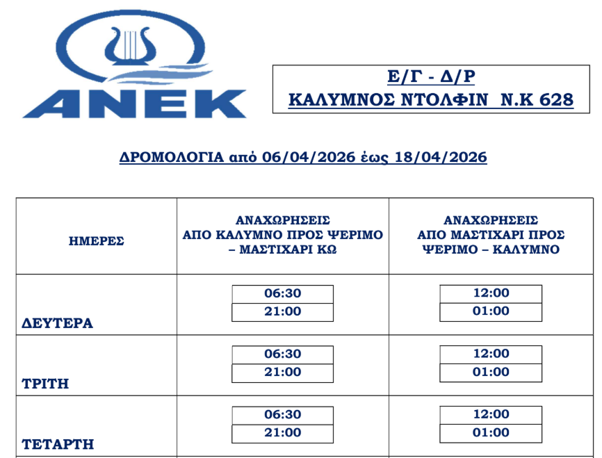 Τα δρομολόγια του “ΚΑΛΥΜΝΟΣ ΝΤΟΛΦΙΝ” από 6-18 Απριλίου 2026