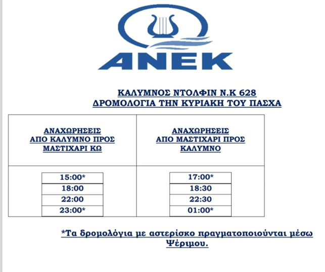 Τα δρομολόγια του “ΚΑΛΥΜΝΟΣ ΝΤΟΛΦΙΝ” σήμερα Κυριακή του ΠΑΣΧΑ,12 Απριλίου 2026.