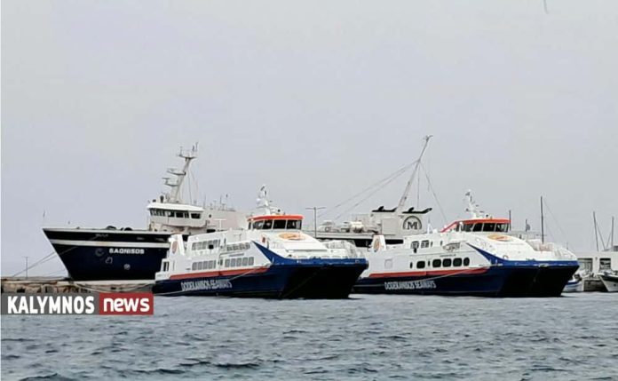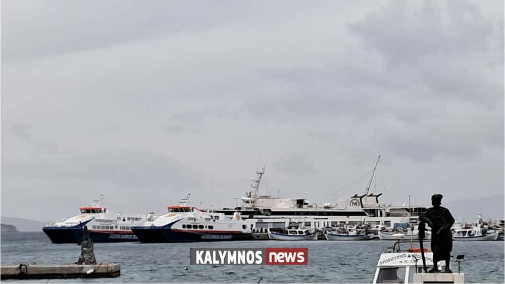 Στο λιμάνι της Καλύμνου παραμένουν ελλιμενισμένα τα δρομολογιακά πλοία, με το Ε/Γ-Ο/Γ «ΣΑΟΝΗΣΟΣ» να έχει πλαγιοδετήσει, ενώ δεμένα βρίσκονται και τα δύο καταμαράν της Dodekanisos Seaways, «Dodekanisos Pride» και «Dodekanisos Express».
