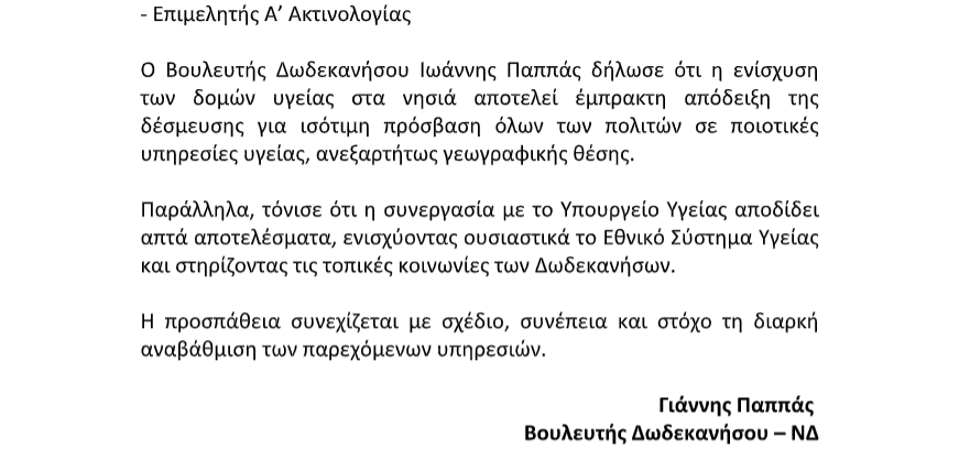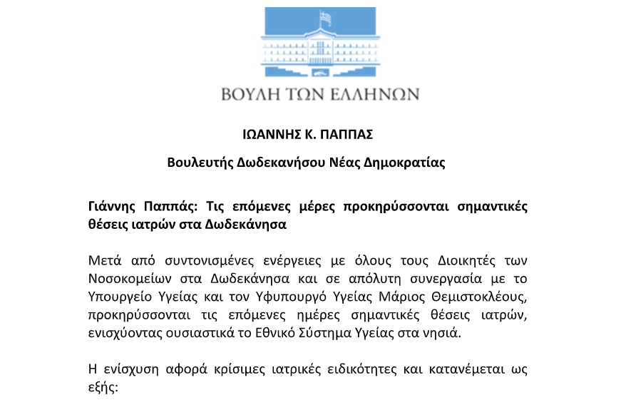 Γιάννης Παππάς: Τις επόμενες μέρες προκηρύσσονται σημαντικές θέσεις ιατρών στα Δωδεκάνησα-Οι θέσεις για το Νοσκομείο Καλύμνου.