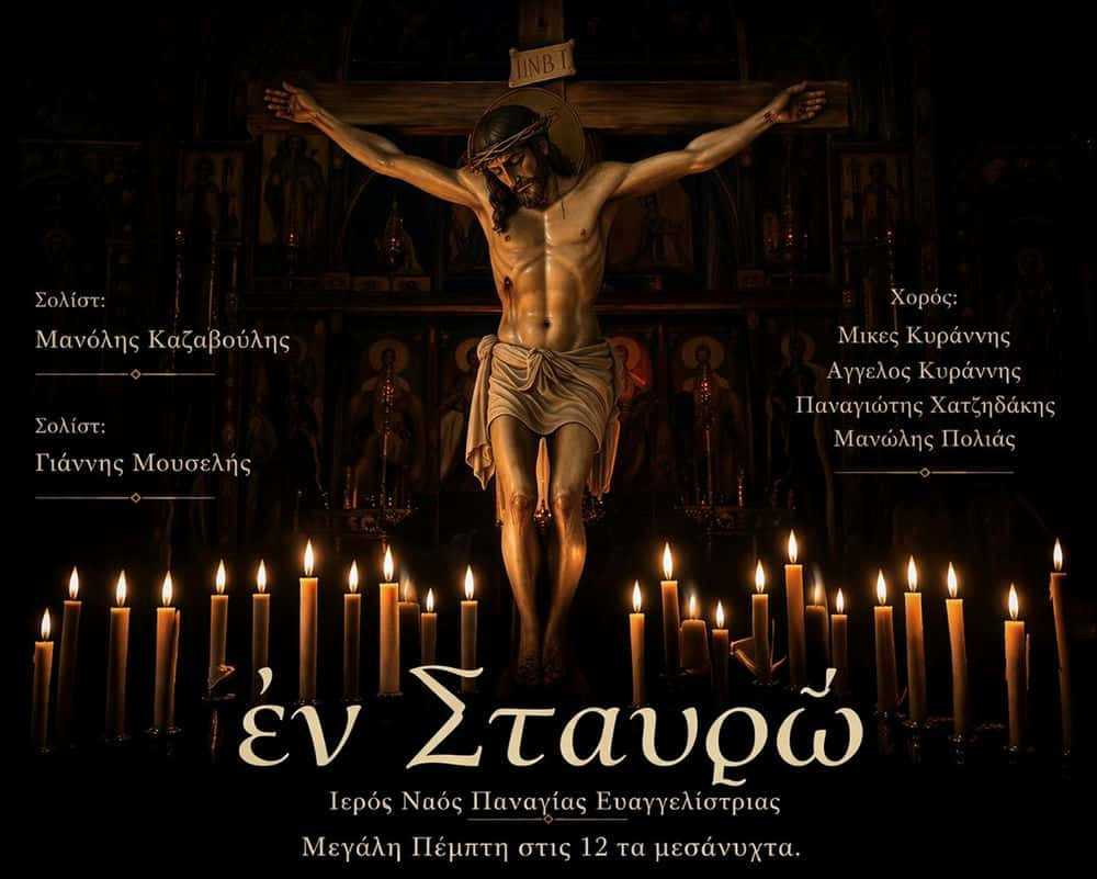 Η εκδήλωση, με τίτλο «Εν Σταυρώ», θα λάβει χώρα μπροστά στον Εσταυρωμένο, υπό το λιγοστό και συμβολικό φως των κεριών, δημιουργώντας μια ατμόσφαιρα βαθιάς συγκίνησης και μυσταγωγίας, απόλυτα εναρμονισμένη με το πνεύμα των ημερών της Μεγάλης Εβδομάδας.