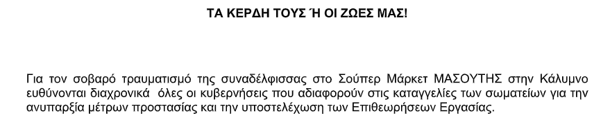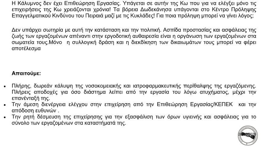 Το Εργατικό Κέντρο Βορείου Συγκροτήματος Δωδεκανήσου καταγγέλλει τον σοβαρό τραυματισμό εργαζόμενης σε σούπερ μάρκετ στην Κάλυμνο
