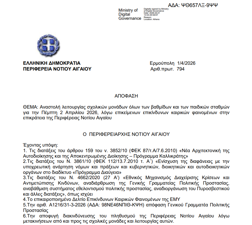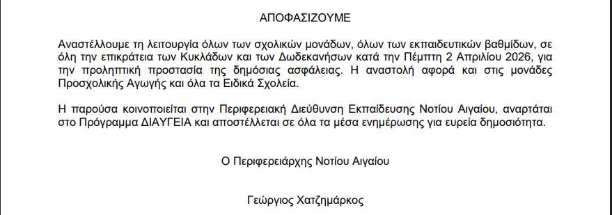 Με απόφαση του Περιφερειάρχη Νοτίου Αιγαίου, Γεωργίου Χατζημάρκου, αναστέλλεται η λειτουργία όλων των σχολικών μονάδων και των παιδικών σταθμών στην Περιφέρεια, και για αύριο Πέμπτη 2 Απριλίου 2026. Η απόφαση αφορά όλες τις βαθμίδες εκπαίδευσης, συμπεριλαμβανομένων των Ειδικών Σχολείων και των μονάδων Προσχολικής Αγωγής, και έχει ληφθεί προληπτικά λόγω επικίνδυνων καιρικών φαινομένων που αναμένονται στην περιοχή.
