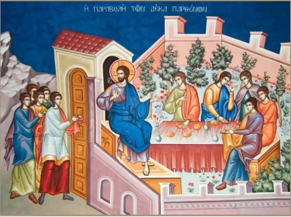 α) Των δέκα παρθένων (Ματθ. 25,1-13), που μας διδάσκει να είμαστε έτοιμοι και γεμάτοι από πίστη και φιλανθρωπία.