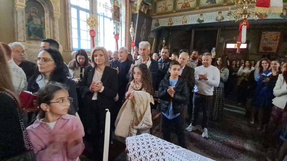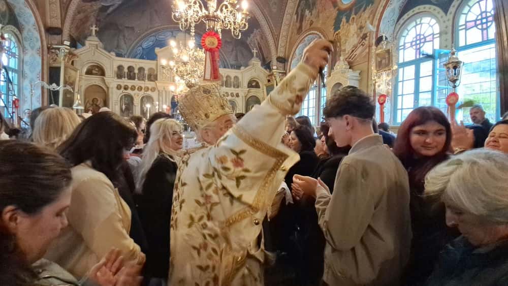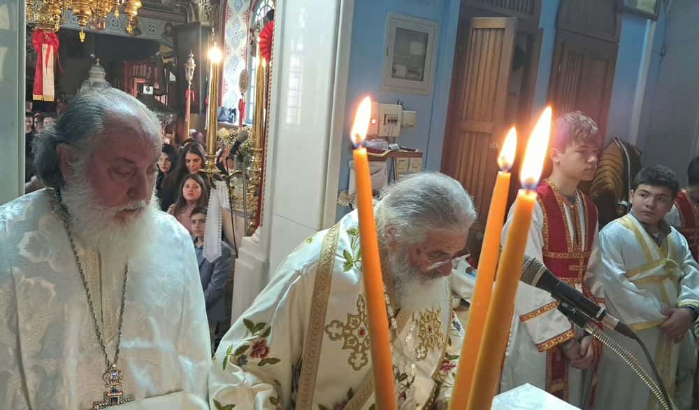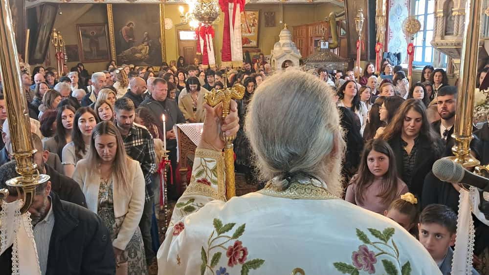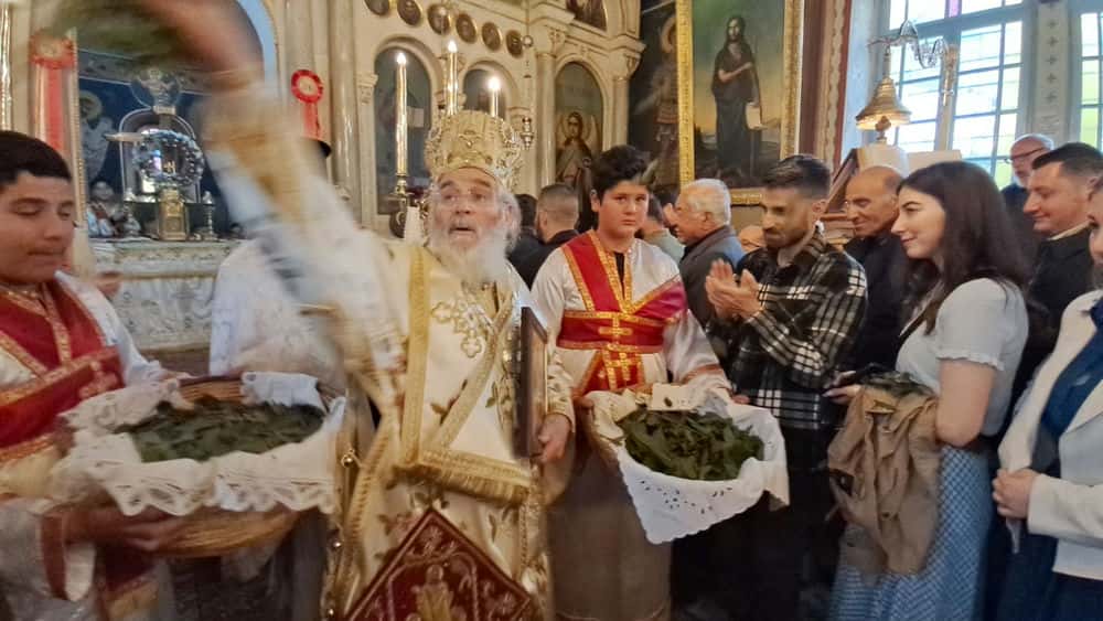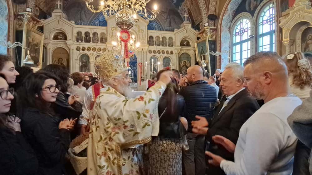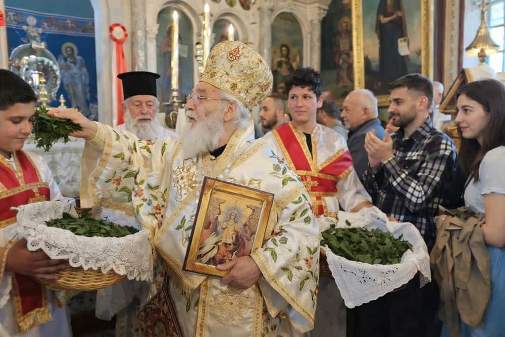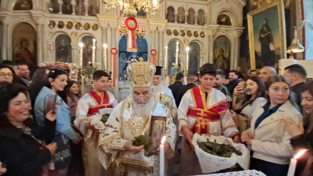 Παράλληλα, ο Μητροπολίτης έραινε τους πιστούς με φύλλα δάφνης, μία πράξη βαθιά συμβολική, που παραπέμπει στη νίκη, την ελπίδα και την αναγέννηση. Τα φύλλα σκορπίζονταν στον χώρο του ναού, ενισχύοντας το κλίμα συγκίνησης και πνευματικής ανάτασης.